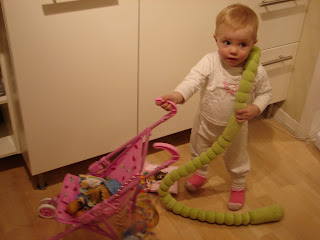 I had always thought that I would not encourage any daughter of mine in frilly excesses. I would not push pink, I would not push dolls (unless two-headed or otherwise subverted in their preciousness), I would not push princesses. I would not peddle pretty pretty. If she was going to gravitate toward these things, fine, but she would do so of her own accord, and not because they were the only options available. So it is that WonderBaby has, since birth, been surrounded by books and blocks and trains and the odd odd dolly. And, since she encountered one during a visit with a friend, a toy stroller. A toy stroller that is now thoroughly be-blinged with makeshift costume jewellry and covered in all manner of small bag and scarf and inhabited by whatever stuffed comrade is deemed deserving of pimped-out pasha treatment.